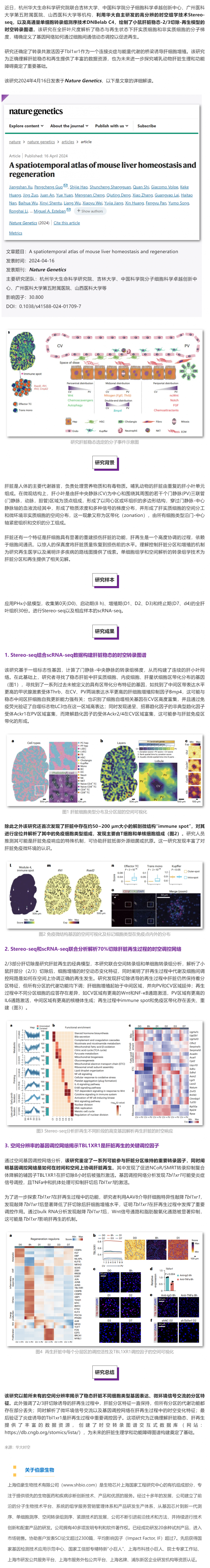 Nature Genetics | Stereo-seq 助力構(gòu)建小鼠肝臟穩(wěn)態(tài)及再生模型的時(shí)空轉(zhuǎn)錄圖譜