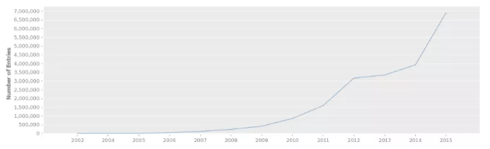 圖 1 DGV 數據庫變異數目逐年增加情況