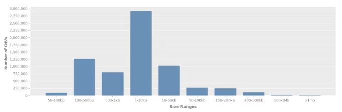 拷貝數變異數據收錄于 DGV 數據庫(http://dgv.tcag.ca/dgv/app/home),記錄了一系列基因變異與表型相關的信息,數據庫信息持續更新,截至 2020.2.19,DGV 數據庫收錄了總共 72 項研究 6359956 個樣本的 CNV 信息,大多數的 CNV 分布在 1 -10Kb,其次為 100-500bp。