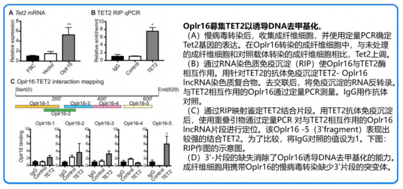 啟動子甲基化分析檢測 Osclr8 對 Oct4 啟動子甲基化是否有保護作用,另通過 RT-PCR 方法檢測重編程過程中 3 種 TET 的表達,應用 lncRNA 染色質免疫共沉淀方法檢測 TET 蛋白是否與 Oplr16 結合明確 lncRNA Oplr16 與 TET 結合片段。
