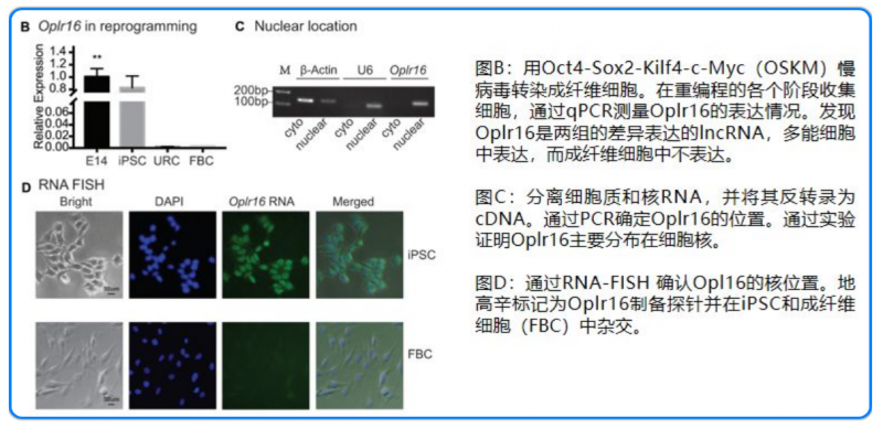 潛在的多能性相關的 lncRNA 應滿足兩個標準能力,首先,具有調節干細胞核心因子基因例如 Oct4,Sox2 和 Nanog 的能力。其次,響應多能性狀態而差異表達。本文作者提出了一種新穎的策略來尋找滿足這兩個標準的潛在 lncRNA。使用染色質 RNA 原位逆轉錄測序(CRIST-seq)方法確定哪些 lncRNA 與 Oct4 啟動子相互作用,然后使用常規的 RNA 轉錄組測序(RNA-seq)來鑒定可能與多能性重編程相關的差異表達的 lncRNA。RNA-seq 用于鑒定在重編程過程中收集的成纖維細胞和 iPSC 之間差異表達的 RNA。進一步鑒定 Oplr16 是多能性相關的 lncRNA。作者分離了細胞質和核 RNA 進行亞細胞分級測定。RT-PCR 顯示,Oplr16 主要位于細胞核中(圖 1C)。RNA-FISH 分析也驗證了其在 iPSC 中的核定位(圖 1D)。這些結果表明 Oplr16 是在體細胞重編程過程中被激活的小鼠核 lncRNA。