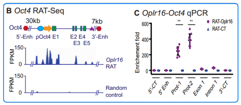 使用 RNA 逆轉錄相關陷阱測序(RAT-seq)方法來分析 Oplr16 的靶基因。分析顯示 Octr16 在 Oct4 基因座富集,在啟動子區域有一個峰,對照大鼠在該基因座處未顯示結合峰。定量 PCR 也顯示 Oplr16 在 Oct4 的啟動子區域富集。