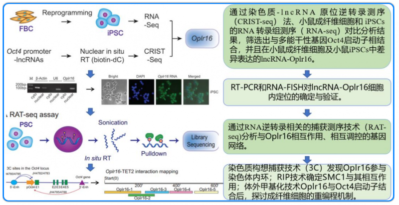 多能特異性染色質網絡的形成是體細胞重編程為多能性狀態的關鍵。研究人員利用“染色質 RNA 原位逆轉錄測序”(CRIST-SEQ) 分析了與多潛能主控基因 Oct4 相互作用的 RNA 成分,研究發現了核 lncRNA Oplr16 與重編程的啟動密切相關。Oplr16 不僅與 Oct4 的啟動子相互作用調節其活性,還在重編程為多能性的過程中被特異性激活,激活表達的 Oplr16 是胚胎干細胞維持多能性所必需的,Oplr16 還能促進成纖維細胞重編程為多能細胞。RNA 逆轉錄相關的 TRAP 測序(RAT-SEQ) 結果表明,Oplr16 與多個與干細胞自我更新相關的靶基因相互作用。Oplr16 利用其 3’端片段招募染色質因子 SMC1 來調控多能特異性染色體內環結構的形成。在與 Oct4 啟動子結合后,Oplr16 招募 TET2 誘導成纖維細胞 DNA 去甲基化并激活 Oct4,增強重編程。這些研究數據表明 Oplr16 作為一個關鍵的染色質因子可能通過調節染色質結構和 DNA 去甲基化來調控干細胞的命運。