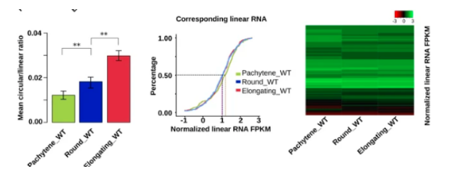 作者通過檢測三種精子形成所必需基因(Ddx4、Spag16 和 Trim37) 的線狀和環形水平來實驗驗證這一發現。這些數據表明,從粗線精母細胞和圓形精子細胞退化為細長精子細胞時,環狀 RNA 的水平會升高。