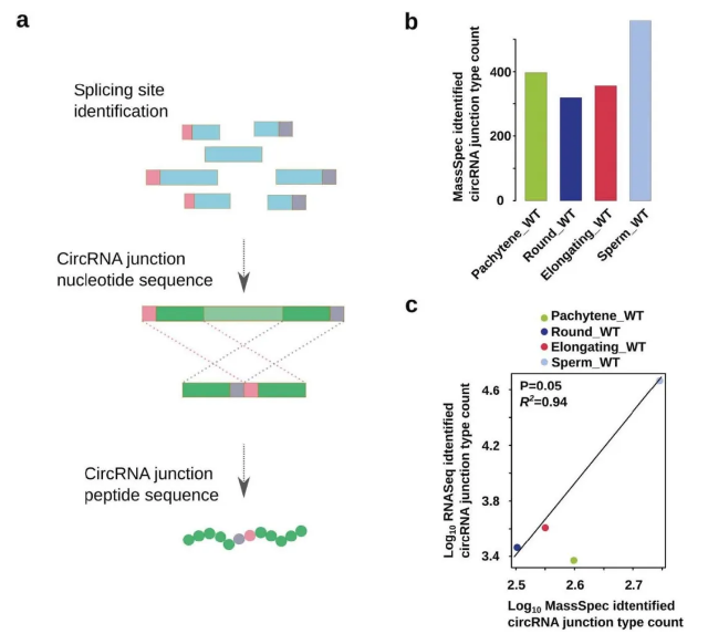 如上所述,環狀 RNA 的翻譯代表一種代償機制,以確保晚期精子形成的關鍵蛋白的持續產生。然而,翻譯的直接證據仍然缺乏。很難明確地證明環狀 RNA 的翻譯,因為環狀 RNA 和它們的同源線性形式都具有相同的 ORFs。因此,作者無法區分檢測到的肽的來源(環狀 RNA 和它們的線性形式)。由于豐度極低,需要使用基于 LC-MS 的蛋白質組學方法來識別這些罕見但獨特的連接肽。將 LC-MS 鑒定的所有肽段與數據庫進行比對,從三種生精細胞類型和精子中鑒定出數百個高可信的連接肽(99%)。作者還在 NCBI 蛋白數據庫中對這些連接肽進行了分析,發現只有 1 - 2 次比對上,表明假陽性率很低(<0.5%)。因此,大多數(99.8%) 的多肽是環狀 RNA 的連接序列所特有的。這些數據有力地表明,男性生殖細胞環狀 RNA 在減數分裂晚期和單倍體男性生殖細胞中積累,并為晚期精子形成和正常精子功能提供持續的蛋白質供應。