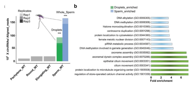 作者純化了胞質液滴(CDs),這是一種只存在于附睪精子中的瞬時細胞器,作者發現 CDs 中也含有大量環狀 RNA。作者分析了全精子和精子頭部的 circRNA 含量,發現全精子中獨特的 circRNA 數量是精子頭部的 3 倍,說明大部分環狀 RNA 定位于精子尾部和連接部位 / 頸部。作者還發現約 30% 的精源性環狀 RNA 存在于伸長的精細胞中,說明精源性環狀 RNA 來源于精子發生。