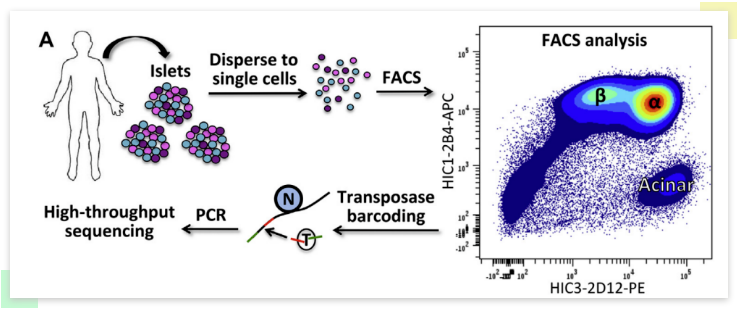 文章使用高靈敏度的 ATAC-seq 分析人 α 細胞和 β 細胞中的開放染色質,高精度定位潛在的 α 細胞和 β 細胞特異性基因的調控區域。與人 α 細胞和 β 細胞轉錄組的整合發現了這兩種細胞類型的特征基因。對 ATAC-seq 所定義的開放染色質區域與一些糖尿病風險 snp 位點有重疊,以及對可能在 α 和 β 細胞中發揮重要作用的新轉錄因子有富集。本研究為未來的研究提供了一個重要的數據集和多種新的研究途徑。