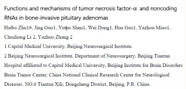 研究人員對 274 位垂體腺瘤患者進行隨訪及臨床變量分析,結果顯示骨侵襲與女性,腫瘤大體積,非總切除(NGTR)和腫瘤再生之間存在顯著相關性。與 NBIPAs 相比,BIPAs 的 PFS(無進展生存期)更差。利用 ceRNA 芯片、miRNA 芯片對 BIPAs 和 NBIPAs 患者的腫瘤組織進行差異 RNA 表達檢測及差異分析,結果顯示炎癥和免疫因子在 BIPAs 中起重要作用,TNF- α 可直接誘導 BIPAs 中的破骨細胞分化。NR_033258,lncRNA SNHG24,miR-181c-5p 和 miR-454-3p 可以調節 TNF- α 的表達。因此,TNF- α 及其相關的 lncRNA 和 miRNA 可能是未來 BIPAs 潛在的治療靶點。