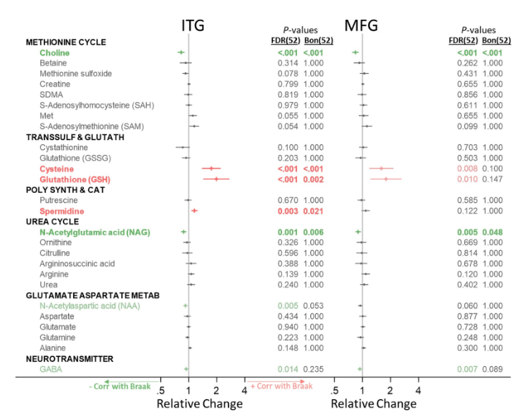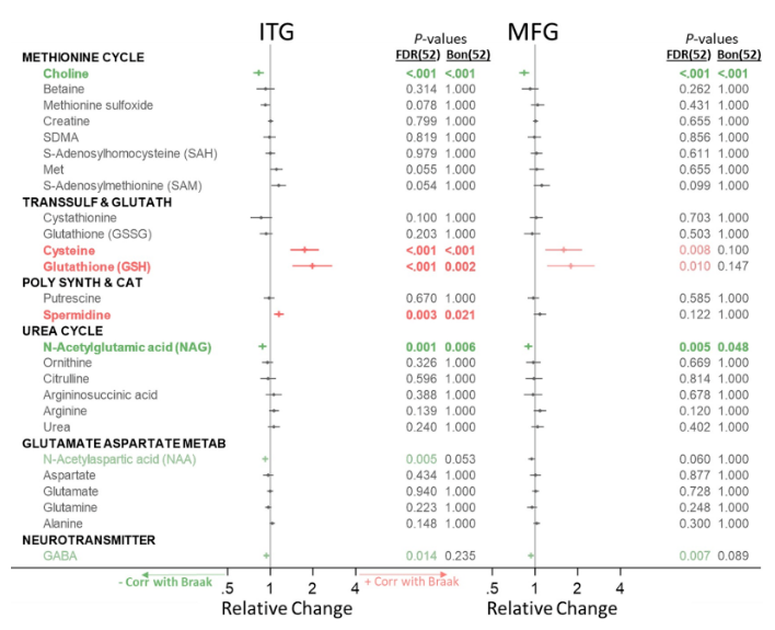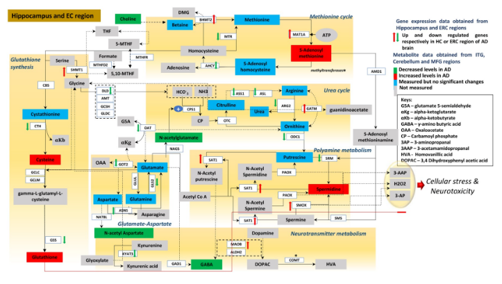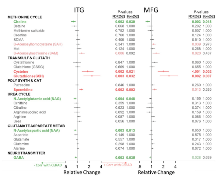 本研究者先前的研究表明了 AD 中的糖酵解、脂肪酸和磷脂代謝的異常,本研究則發現了研究了轉甲基化途徑(一碳單位的主要代謝來源)和密切相關的多胺合成 / 分解代謝途徑的失調與 AD 的發病相關。包括神經遞質信號、尿素循環、天冬氨酸類谷氨酸代謝和谷胱甘肽合成的異常。(研究者將 ITG 組差異的主要結果在特定的生化途徑中)