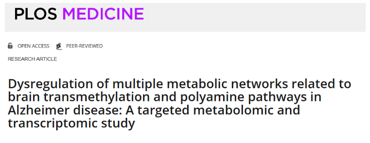 參考文獻 Uma V. Mahajan, Vijay R. Varma,et al. Dysregulation of multiple metabolic networks related to brain transmethylation and polyamine pathways in Alzheimer disease: A targeted metabolomic and transcriptomic study. PLoS Med.2020; 17(1):e1003012. Epub2020/01/14