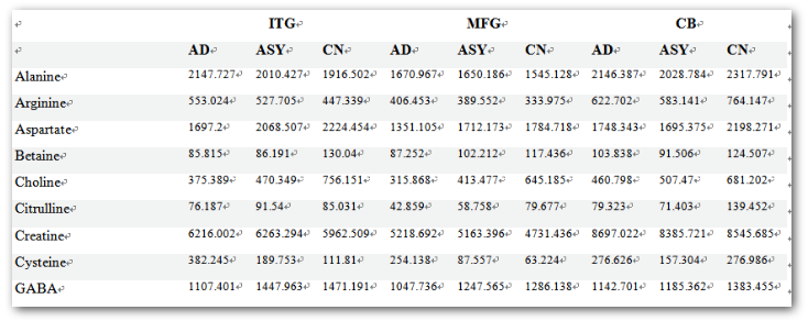 5. 谷氨酸 - 天冬氨酸代謝 在 ITG 中,AD 中的 NAA (P=0.002*) 濃度較低。與 CN 相比,AD 的 FH,MDH1,MDH2,GLS2 和 GOT2 基因在海馬 / ERC 中的表達降低。
