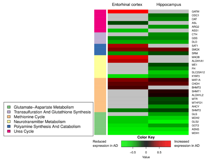甲基化和多胺途徑相關的生化反應的六個類別中的 33 個基因(FDR 校正的 p 值 <0.05)中,AD 和 CN 的 ERC /HIP 區域的基因表達水平發生了變化。使用 FDR 校正多次后,AD 和 CN 樣品之間基因表達的這些差異具有統計學意義,與 CN 相比,圖 4 總結了 AD 患者的 HIP/ERC 中與轉甲基化和多胺代謝相關的所有六類生化反應的差異表達基因。灰色表示 AD 患者和對照組的基因表達沒有顯著差異。
