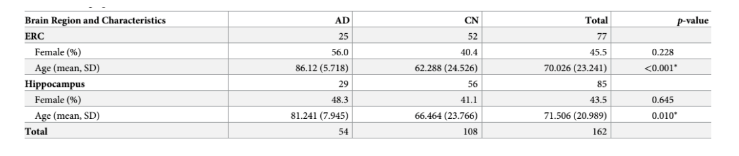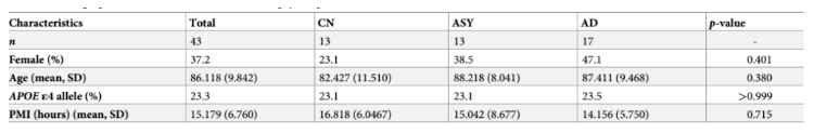 研究者采用 R -Studio1.1.453 和 STATA16.0 軟件進行分析。使用 α 值 0.05 來確定統計學意義。同時進行了多重比較方法 Benjamini-Hochberg 錯誤發現率(FDR=0.05)和 bonferoni 校正(FWER=0.05)。兩種比較方法均校正了 52 種比較(26 種代謝物×2 個主要腦部區域 ITG 和 MFG),這些比較是基于它們對不同 AD 病理的易感性而預先指定的。檢查了三組(AD,ASY 和 CN)在性別,APOEε4 攜帶者狀態(Fisherexact 試驗),年齡和驗尸間隔(PMI)(Kruskal-Wallis 測試)方面的差異樣。信息如表 2: