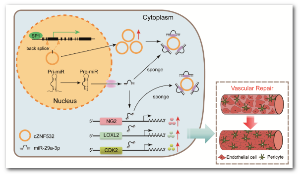 摘要: 糖尿病視網膜病(DR)是工作年齡成人視力喪失的主要原因。血管周細胞變性是 DR 的主要臨床表現,但對周細胞變性的機制了解甚少。環狀 RNA(circRNA)在多種生物學過程和疾病進展中起重要作用。該研究中,研究者調查了 circRNA 在周細胞生物學和糖尿病引起的視網膜血管功能障礙中的作用。在糖尿病應激下的周細胞中,糖尿病鼠模型的視網膜血管中以及糖尿病患者的玻璃體液中,cZNF532 的表達上調。cZNF532 沉默可降低周細胞的活力,增殖和分化,并抑制周細胞向內皮細胞募集。cZNF532 通過充當 miR-29a-3p 海綿并誘導 NG2,LOXL2 和 CDK2 的表達增加,進而調節周細胞生物學功能。降低 cZNF532 或 miR-29a-3p 的表達加劇了鏈脲佐菌素誘導的視網膜周細胞變性和血管功能障礙。相比之下,cZNF532 的過表達或 miR-29a-3p 的抑制可改善人糖尿病性視網膜病變引起的玻璃體和視網膜周細胞變性和血管功能障礙。該研究結果數據確定了 circRNA 介導的機制,可協調 DR 中的周細胞生物學和血管穩態。誘導 cZNF532 或抑制 miR-29a-3p 是治療 DR 的一種可利用的治療方法。