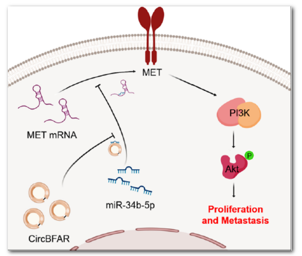 圖示:circBFAR 通過 miR-34b-5p/MET 通路促進 PDAC 增殖和轉移 的提示機制