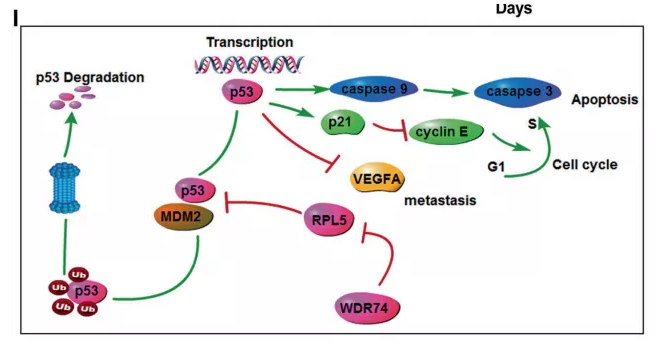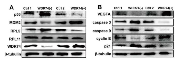 本文的思路是,發掘前期的研究結果,聯系本次發現的新分子。前期的眾多研究顯示,在多種腫瘤中,腫瘤的進展與 RP–MDM2–p53 通路相關。那么 WDR74 是否也與此通路相關?還是采用 A375 的 WDR74 過表達和敲除細胞株,先關注一下通路蛋白在過表達和敲除細胞株里的表達變化,進行 Western Blot。結果表明,p53、MDM2、RPL5 的表達量,都與 WDR74 的表達量相關,并且,p53 的下游基因,VEGFA、caspase 等,也都與 WDR74 的表達量相關。