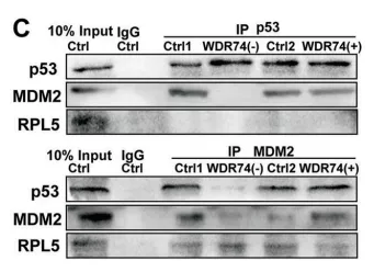 機制還需要證明相互作用。作者證明,WDR74 對于 p53 和 MDM2 的結合是必需的。