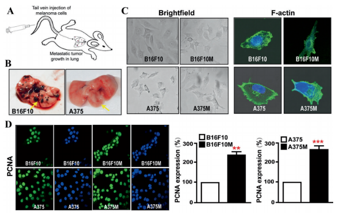 首先,樣本是建立的轉移細胞株。圖 1 說明細胞系建立方法,并驗證了一些關鍵的指標證明細胞系已建立。建立方法是將小鼠黑色素瘤細胞系 B16F10,及人黑色素瘤細胞系 A375 通過尾靜脈注射進小鼠體內,取肺轉移組織,取原代細胞進行培養,得到相應的轉移細胞株 B16F10M 和 A375M。下圖展示了形態(偽足形態),并表達了更高的增殖細胞核抗原(PCNA),證明構建是成功的。