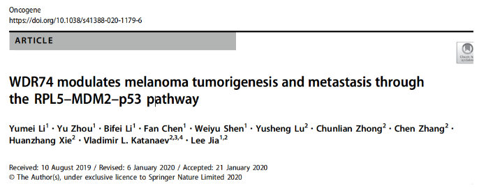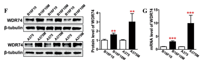 在裸鼠中,注射 WDR74 的過表達和敲除穩定株進行成瘤實驗。結果表明,WDR74 促進了黑素瘤瘤體生長和遠端轉移。原文圖 6。