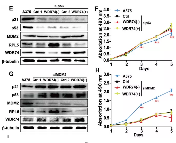 作者還進行了拯救實驗,在已建立的 WDR74 的過表達和敲除穩定株的基礎上,轉入了 p53、MDM2 的 siRNA,然后檢測各相關分子的表達,及細胞的增殖。這些結果要與前面的單 WDR74 的過表達及敲除穩定株的結果相比,表明了上下游的邏輯關系——在此分子上游的仍受 WDR74 影響,在此分子下游的不受 WDR74 影響。圖 F 證明了 p53 是位于通路的下游,切斷 p53 這環就切斷了 WDR74 對細胞的影響。圖 G 表明 RPL5 是 MDM2 的上游,p53 是 MDM2 的下游。