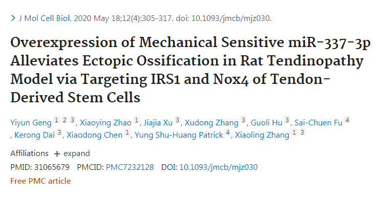 肌腱病,以肌腱異位骨化為特征,在某些人群中是一種常見疾病,比如那些肌腱重復性勞損的運動員。然而,肌腱過度使用引起的肌腱病變的分子機制仍然缺乏。在這里,作者發現機械敏感性 miRNA,miR-337-3p,在單軸周期性機械負荷下,在腱源性干細胞(TDSCs)及陰性對照的軟骨成骨細胞分化而來的 TDSCs 種,表達較低。重要的是,miR-337-3p 在大鼠和人鈣化肌腱中的表達均下調,而在大鼠肌腱病變模型的髕腱中 miR-337-3p 的過表達則顯示出強大的治療效果。在機制上,作者發現促炎細胞因子白細胞介素 -1β 是 miR-337-3p 的上游,它將機械負荷與 miR-337-3p 的下調聯系起來。此外,miR-337-3p 的靶基因,NADPH 氧化酶 4 和胰島素受體底物 1,分別通過 JNK 和 ERK 信號激活 TDSCs 的軟骨成骨分化。因此,這些發現不僅為肌腱病異位骨化的分子機制提供了新的見解,而且也突出了 miR-337-3p 作為臨床治療肌腱病的一個可能靶點的意義。