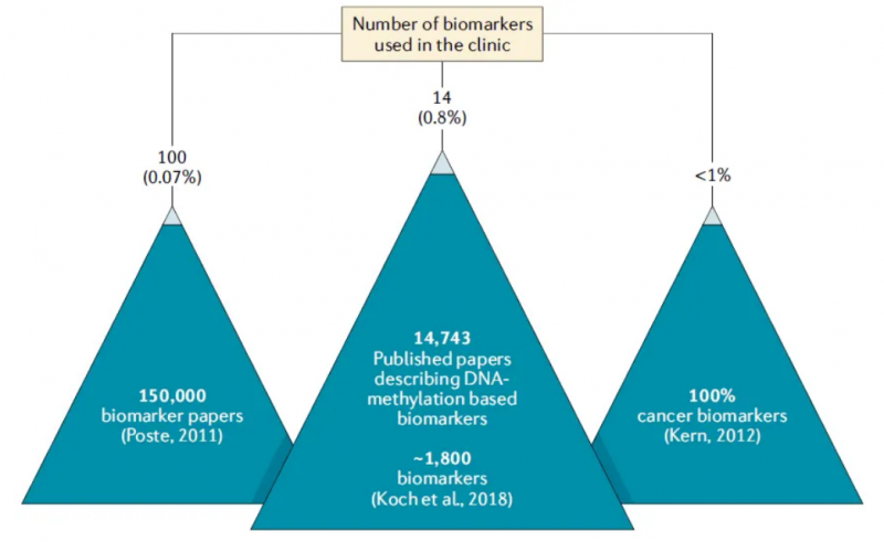 上述的轉(zhuǎn)化成功率以及目前公眾對科學研究的可靠性和效率的討論,都值得作者反思,為什么很少有 DNA 甲基化的生物標記從發(fā)現(xiàn)和發(fā)表過渡到臨床試驗。這個問題的答案是復雜的、多方面的,主要與小樣本測試和缺乏實質(zhì)性的臨床價值,以及各種方法的說明(如有偏差的病人選擇、研究設(shè)計和數(shù)據(jù)分析不當,缺乏驗證和 / 或不恰當?shù)膱蟾妫@些妨礙了徹底評估生物標志物的臨床價值。此外,開發(fā)定量分析特定生物標志物(包括提供驗證和探索臨床應(yīng)用的試驗)所需的資金投入是一個主要障礙。這些問題并不是基于 DNA 甲基化的生物標志物所特有的。生物標志物研究領(lǐng)域的研究人員普遍面臨著類似的問題,盡管這些問題直到現(xiàn)在才開始得到解決。